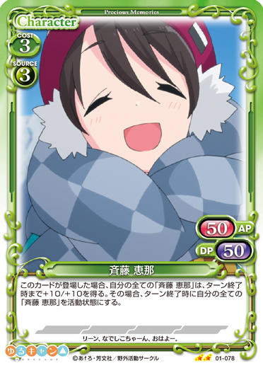 | このカードが登場した場合、自分の全ての「斉藤 恵那」は、ターン終了時まで+10/+10を得る。その場合、ターン終了時に自分の全ての「斉藤 恵那」を活動状態にする。 | ||
