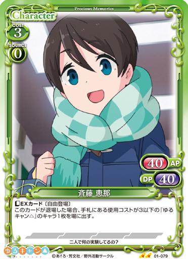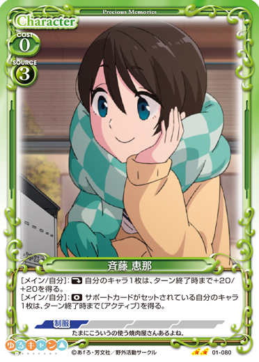 | 〔EXカード〕〔自由登場〕このカードが退場した場合、手札にある使用コストが3以下の『ゆるキャン△』のキャラ1枚を場に出す。 | ||