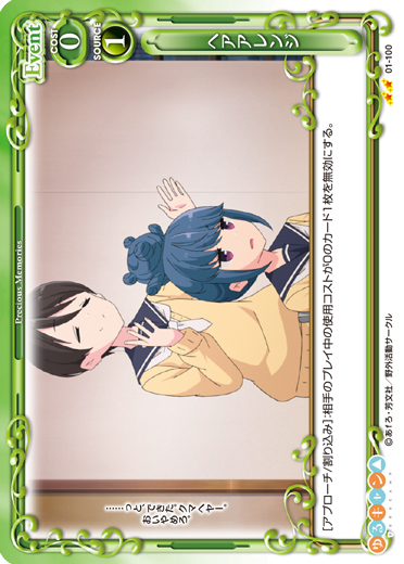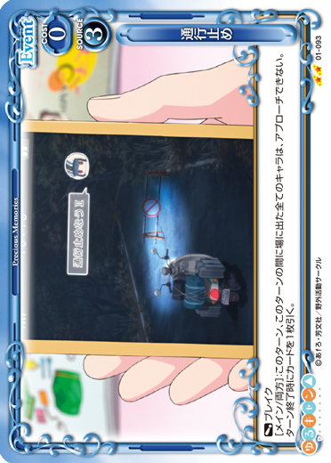 | 〔EXカード〕[メイン/相手]:相手のキャラ1枚は、このターン、アプローチできない。その後、自分の『ゆるキャン△』のキャラ1枚の上にキャンプコインを1個乗せる。 | ||