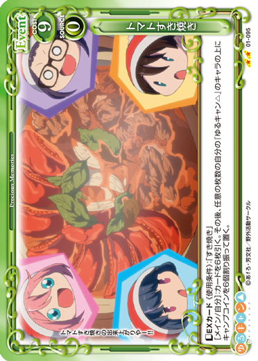 | 〔EXカード〕《使用条件》:「すき焼き」[メイン/自分]:カードを6枚引く。その後、任意の枚数の自分の『ゆるキャン△』のキャラの上にキャンプコインを6個割り振って置く。 | ||