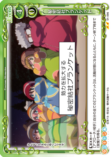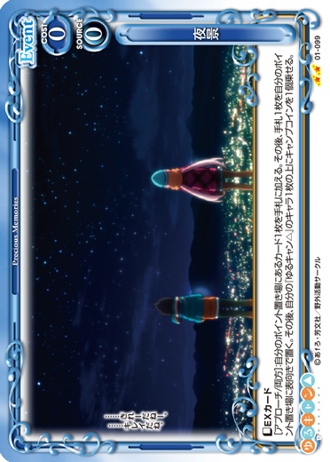 | 〔EXカード〕[アプローチ/両方]:自分のポイント置き場にあるカード1枚を手札に加える。その後、手札1枚を自分のポイント置き場に表向きで置く。その後、自分の『ゆるキャン△』のキャラ1枚の上にキャンプコインを1個乗せる。 | ||