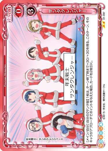 | [メイン/自分]:自分の【サンタ服】1枚は、ターン終了時まで+30/+30を得る。このターン、そのキャラがアプローチでポイントを与えた場合、カードを2枚引く。 | ||