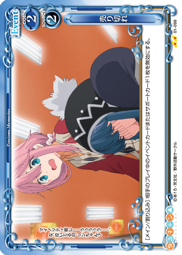 | 〔ブレイク〕[メイン/両方]:このターン、このターンの間に場に出た全てのキャラは、アプローチに参加することができない。ターン終了時にカードを1枚引く。 | ||