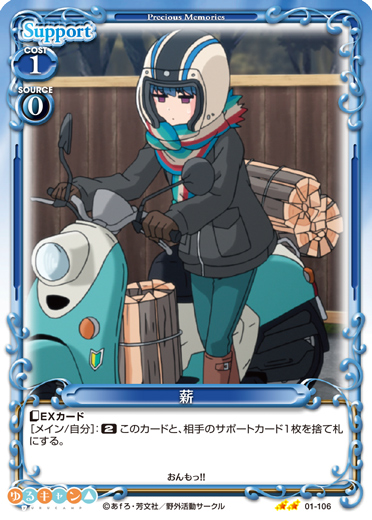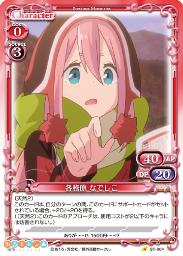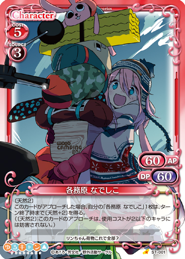 | このカードが登場した場合、このターン、自分が次にプレイする「各務原 なでしこ」または『ゆるキャン△』のサポートカード1枚は、使用コスト-3を得る。このカードは、このカードにサポートカードがセットされている場合、使用コスト+3、+30/+30を得る。 | ||