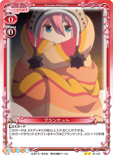 | 〔EXカード〕このカードは、EXデッキに5枚以上入れることができる。このカードがセットされているキャラは【ブランケット】、±0/+10を得る。 | ||