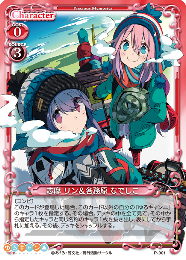 | 〔コンビ〕このカードが登場した場合、このカード以外の自分の『ゆるキャン△』のキャラ1枚を指定する。その場合、デッキの中を全て見て、その中から指定したキャラと同じ名称のキャラ1枚を抜き出し、表にしてから手札に加える。その後、デッキをシャッフルする。 | ||