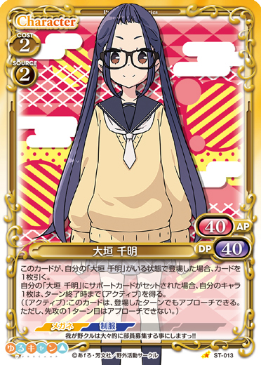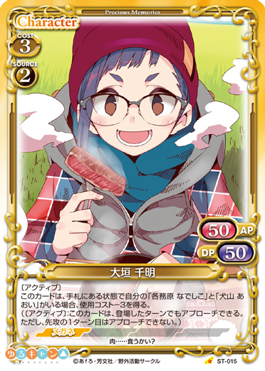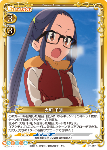 | このカードが登場した場合、自分の『ゆるキャン△』のキャラ1枚は、ターン終了時まで〔アクティブ〕を得る。自分の「大垣 千明」が退場した場合、カードを1枚引く。(〔アクティブ〕:このカードは、登場したターンでもアプローチできる。ただし、先攻の1ターン目はアプローチできない。) | ||