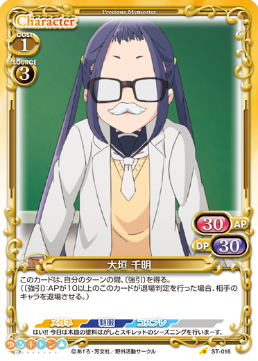 | このカードが登場した場合、このターン、自分が次にプレイする「大垣 千明」または『ゆるキャン△』のサポートカード1枚は、使用コスト-3を得る。このカードは、このカードにサポートカードがセットされている場合、使用コスト+3、+30/+30を得る。 | ||