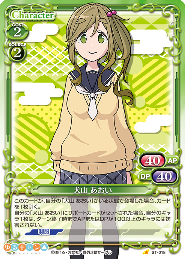 | このカードが、自分の「犬山 あおい」がいる状態で登場した場合、カードを1枚引く。自分の「犬山 あおい」にサポートカードがセットされた場合、自分のキャラ1枚は、ターン終了時までAPまたはDPが100以上のキャラには妨害されない。 | ||