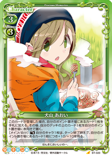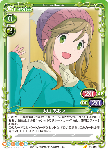 | このカードが登場した場合、このターン、自分が次にプレイする「犬山 あおい」または『ゆるキャン△』のサポートカード1枚は、使用コスト-3を得る。このカードにサポートカードがセットされている場合、このカードは使用コスト+3、+30/+30を得る。 | ||