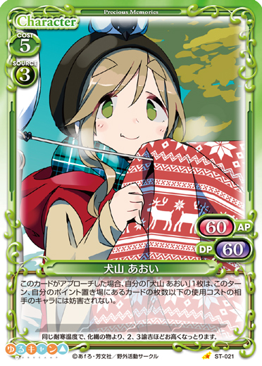 | このカードがアプローチした場合、自分の「犬山 あおい」1枚は、このターン、自分のポイント置き場にあるカードの枚数以下の使用コストの相手のキャラには妨害されない。 | ||