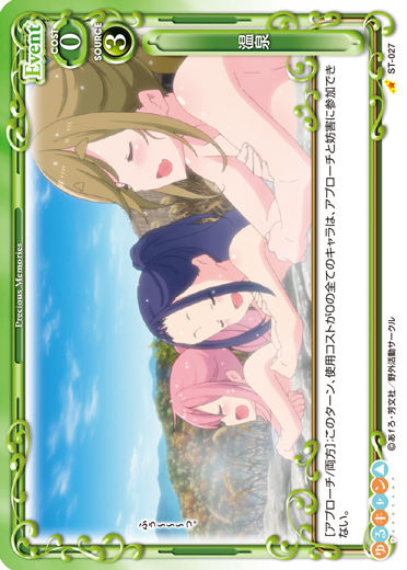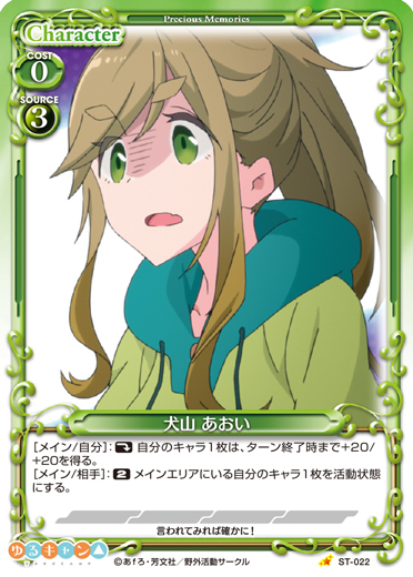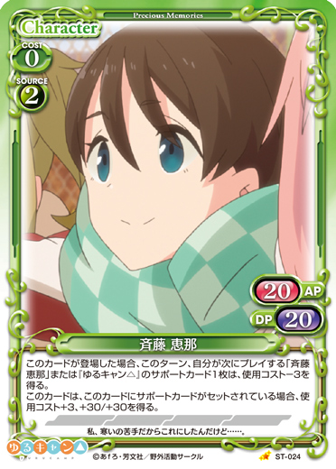 | このカードが登場した場合、このターン、自分が次にプレイする「斉藤 恵那」または『ゆるキャン△』のサポートカード1枚は、使用コスト-3を得る。このカードは、このカードにサポートカードがセットされている場合、使用コスト+3、+30/+30を得る。 | ||