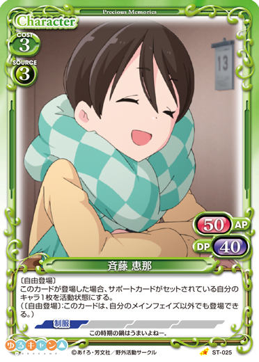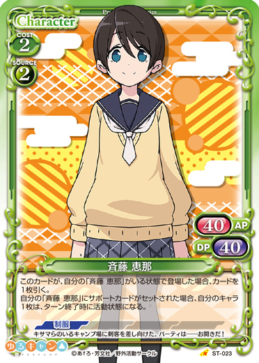 | このカードが、自分の「斉藤 恵那」がいる状態で登場した場合、カードを1枚引く。自分の「斉藤 恵那」にサポートカードがセットされた場合、自分のキャラ1枚は、ターン終了時に活動状態になる。 | ||