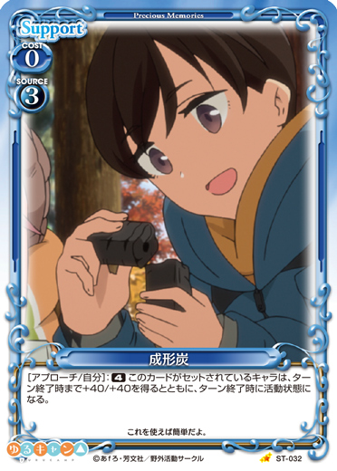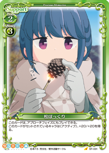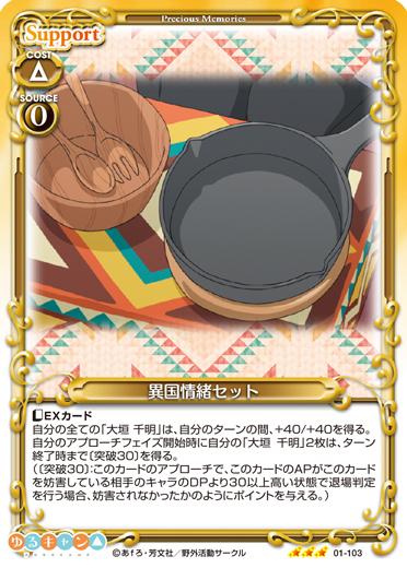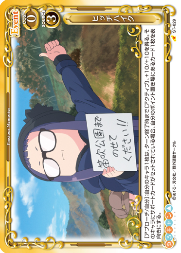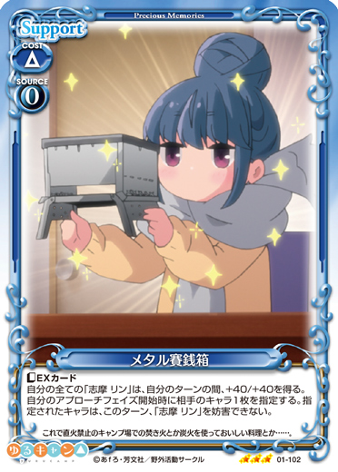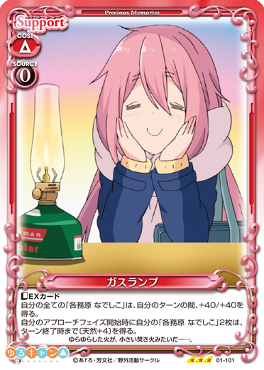 | 〔EXカード〕自分の全ての「各務原 なでしこ」は、自分のターンの間、+40/+40を得る。自分のアプローチフェイズ開始時に自分の「各務原 なでしこ」2枚は、ターン終了時まで〔天然+4〕を得る。 | ||