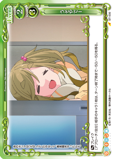 | 〔ブレイク〕[アプローチ/自分]:相手のキャラ1枚は、ターン終了時まで-50/-50を得る。 | ||