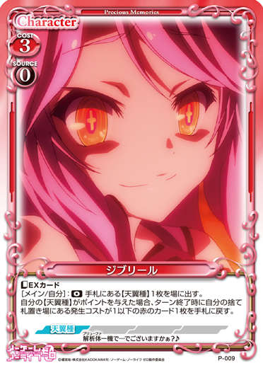 | 〔EXカード〕[メイン/自分]:《0》手札にある【天翼種】1枚を場に出す。自分の【天翼種】がポイントを与えた場合、ターン終了時に自分の捨て札置き場にある発生コストが1以下の赤のカード1枚を手札に戻す。 | ||