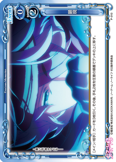 | 〔アクティブ〕このカードは、このターンの間に自分または相手のポイント置き場にカードが置かれた状態で手札にある場合、〔自由登場〕を得る。このカードが登場した場合、カードを1枚引く。このカードが退場した場合、カードを1枚引く。 | ||