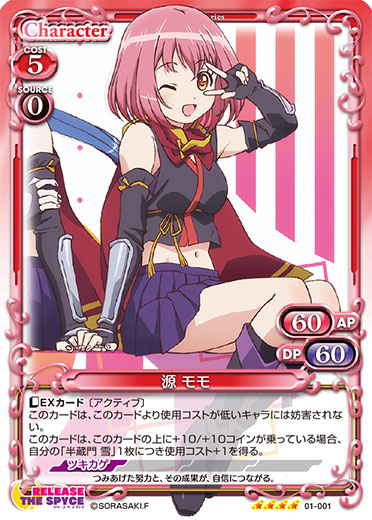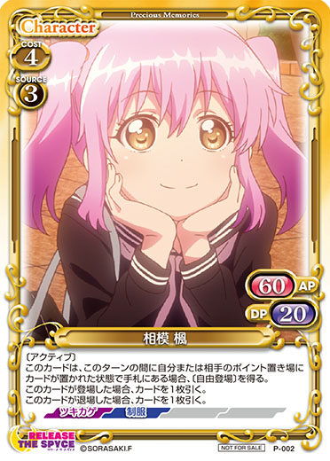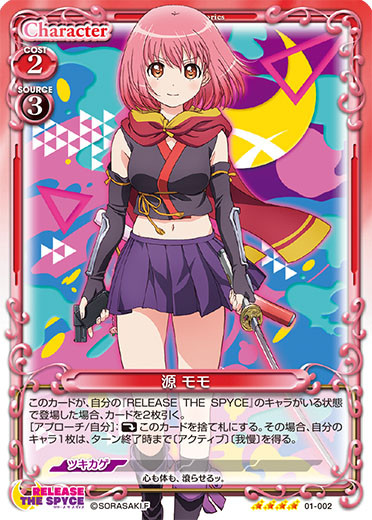 | このカードが、自分の『RELEASE THE SPYCE』のキャラがいる状態で登場した場合、カードを2枚引く。[アプローチ/自分]:《休》このカードを捨て札にする。その場合、自分のキャラ1枚は、ターン終了時まで〔アクティブ〕〔我慢〕を得る。 | ||
