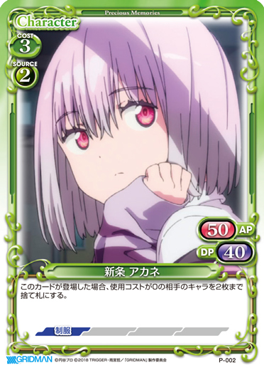 | このカードが登場した場合、使用コストが0の相手のキャラを2枚まで捨て札にする。 | ||