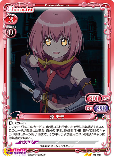 | 〔EXカード〕このカードは、このカードより使用コストが低いキャラには妨害されない。このカードが登場した場合、自分の『RELEASE THE SPYCE』のキャラ1枚は、ターン終了時まで、そのキャラより使用コストが低いキャラには妨害されない。 | ||