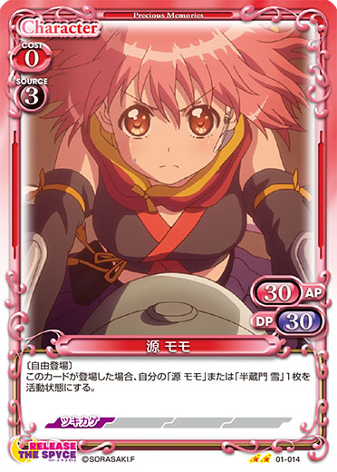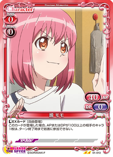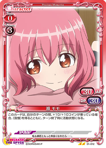| 〔アクティブ〕〔継承〕▶「源 モモ」+10/+10コインが乗っている自分のキャラがアプローチでポイントを与えるごとに、自分のポイント置き場にあるカード1枚を表向きにする。 | ||