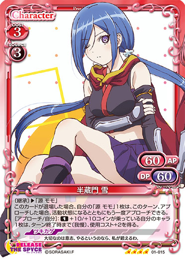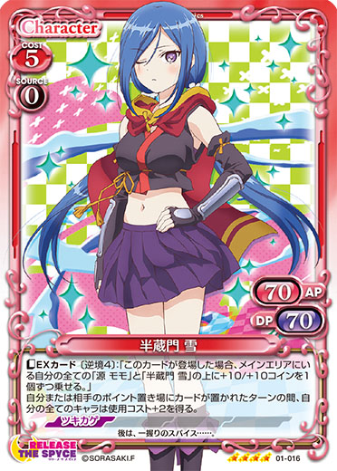| 〔EXカード〕〔逆境4〕:「このカードが登場した場合、メインエリアにいる自分の全ての「源 モモ」と「半蔵門 雪」の上に+10/+10コインを1個ずつ乗せる。」自分または相手のポイント置き場にカードが置かれたターンの間、自分の全てのキャラは使用コスト+2を得る。 | ||