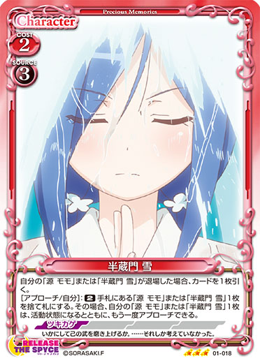 | 自分の「源 モモ」または「半蔵門 雪」が退場した場合、カードを1枚引く。[アプローチ/自分]:《2》手札にある「源 モモ」または「半蔵門 雪」1枚を捨て札にする。その場合、自分の「源 モモ」または「半蔵門 雪」1枚は、活動状態になるとともに、もう一度アプローチできる。 | ||