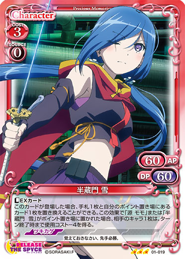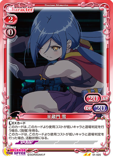 | 〔EXカード〕このカードが登場した場合、手札1枚と自分のポイント置き場にあるカード1枚を置き換えることができる。この効果で「源 モモ」または「半蔵門 雪」がポイント置き場に置かれた場合、相手のキャラ1枚は、ターン終了時まで使用コスト-4を得る。 | ||