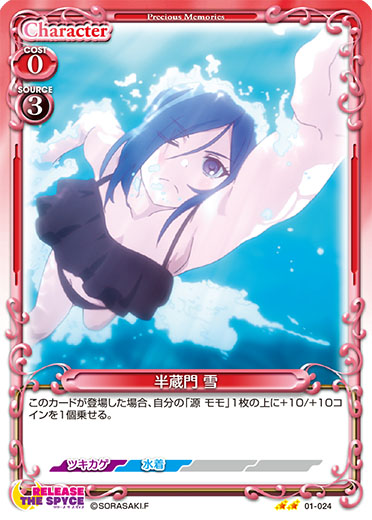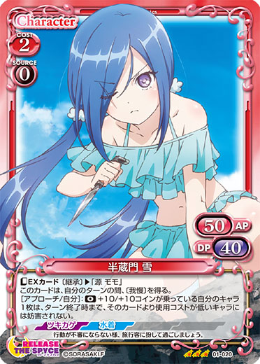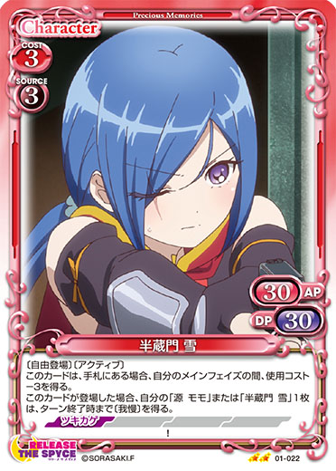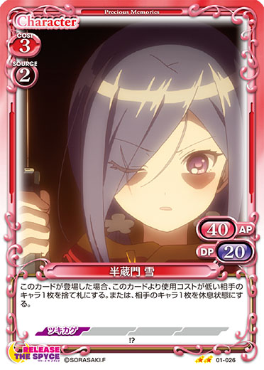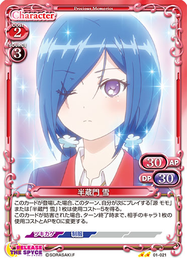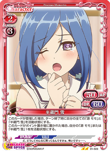 | このカードが登場した場合、このターン、自分が次にプレイする「源 モモ」または「半蔵門 雪」1枚は使用コスト-5を得る。このカードが妨害された場合、ターン終了時まで、相手のキャラ1枚の使用コストとAPを0に変更する。 | ||