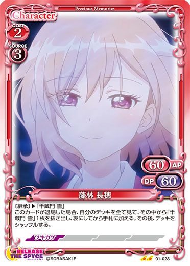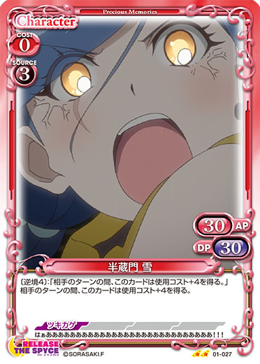 | 〔継承〕▶「半蔵門 雪」このカードが退場した場合、自分のデッキを全て見て、その中から「半蔵門 雪」1枚を抜き出し、表にしてから手札に加える。その後、デッキをシャッフルする。 | ||