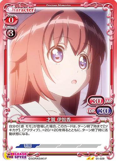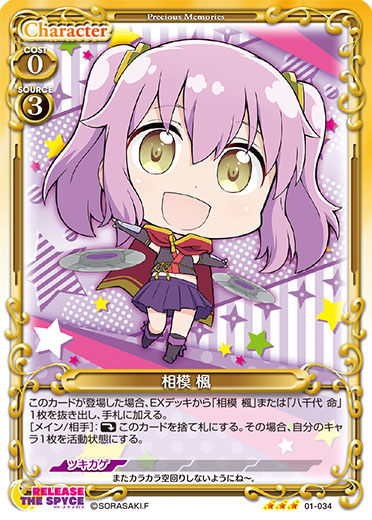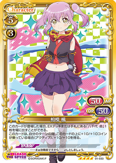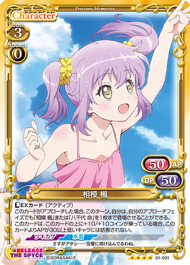 | このカードが登場した場合、EXデッキから「相模 楓」または「八千代 命」1枚を抜き出し、手札に加える。[メイン/相手]:《休》このカードを捨て札にする。その場合、自分のキャラ1枚を活動状態にする。 | ||