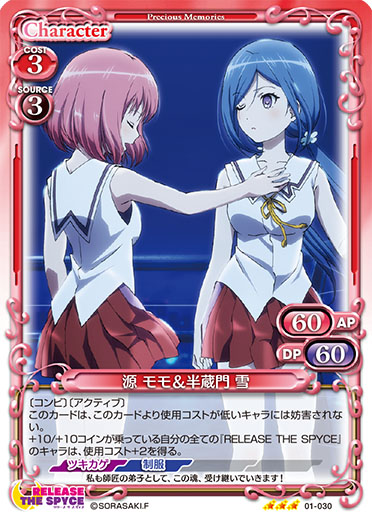 | 〔コンビ〕〔アクティブ〕このカードは、このカードより使用コストが低いキャラには妨害されない。+10/+10コインが乗っている自分の全ての『RELEASE THE SPYCE』のキャラは、使用コスト+2を得る。 | ||