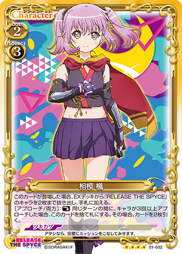 | このカードが登場した場合、EXデッキから『RELEASE THE SPYCE』のキャラを2枚まで抜き出し、手札に加える。[アプローチ/両方]:《休》同じターンの間に、キャラが3回以上アプローチしている場合、このカードを捨て札にする。その場合、カードを2枚引く。 | ||