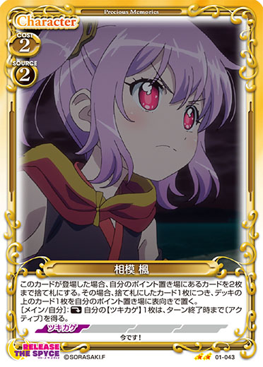 | 〔アクティブ〕〔継承〕▶「相模 楓」+10/+10コインが乗っている自分のキャラのアプローチで相手のキャラが退場した場合、カードを1枚引く。 | ||
