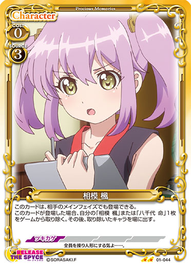 | このカードは、相手のメインフェイズでも登場できる。このカードが登場した場合、自分の「相模 楓」または「八千代 命」1枚をゲームから取り除く。その後、取り除いたキャラを場に出す。 | ||