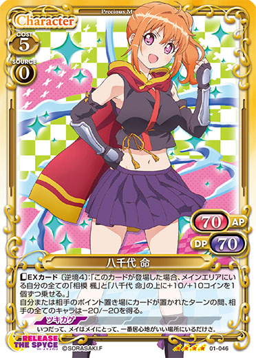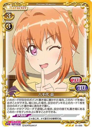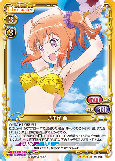 | 〔継承〕▶「相模 楓」このカードがアプローチで退場した場合、手札にある「相模 楓」または「八千代 命」1枚を場に出すことができる。[アプローチ/自分]:《0》+10/+10コインが乗っている自分のキャラ1枚は、ターン終了時までAPが40以下のキャラには妨害されない。 | ||
