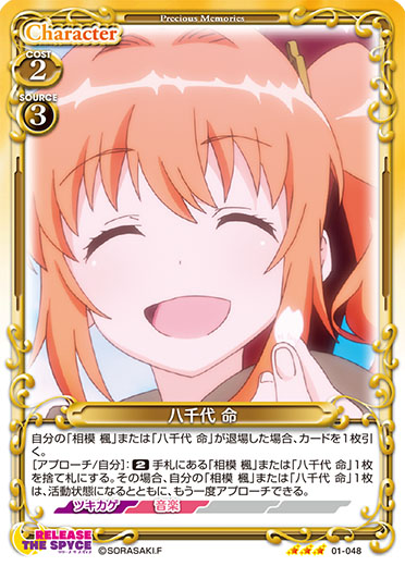 | 自分の「相模 楓」または「八千代 命」が退場した場合、カードを1枚引く。[アプローチ/自分]:《2》手札にある「相模 楓」または「八千代 命」1枚を捨て札にする。その場合、自分の「相模 楓」または「八千代 命」1枚は、活動状態になるとともに、もう一度アプローチできる。 | ||