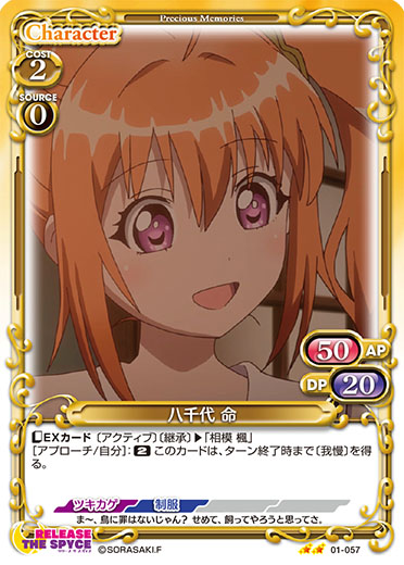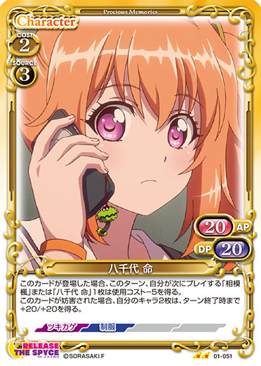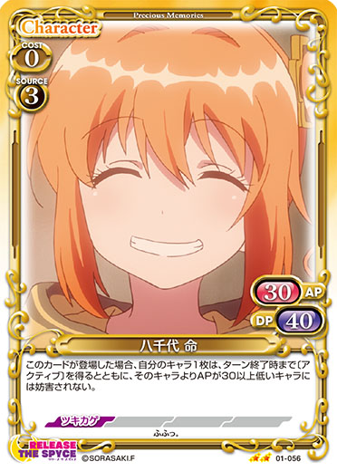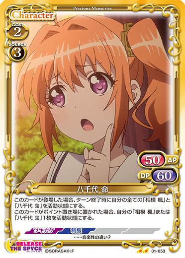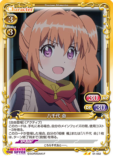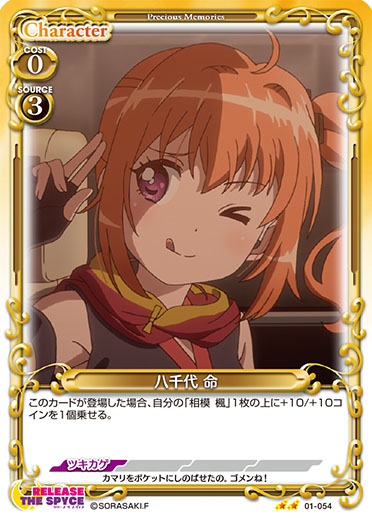 | このカードが登場した場合、このターン、自分が次にプレイする「相模 楓」または「八千代 命」1枚は使用コスト-5を得る。このカードが妨害された場合、自分のキャラ2枚は、ターン終了時まで+20/+20を得る。 | ||