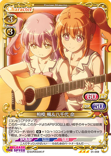 | 〔EXカード〕このカードがアプローチした場合、このカードは、ターン終了時まで+20/+20を得る。このカードの上に+10/+10コインが乗っている場合、代わりに、このターン、自分の全てのキャラは+20/+20を得る。 | ||