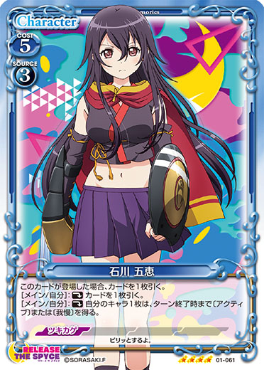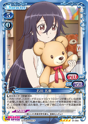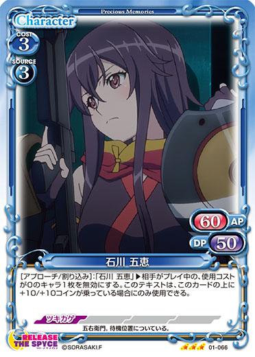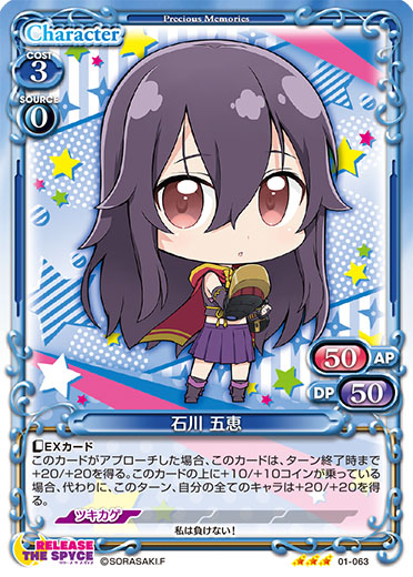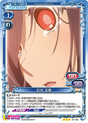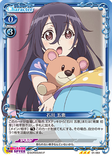 | [アプローチ/割り込み]:「石川 五恵」▶相手がプレイ中の、使用コストが0のキャラ1枚を無効にする。このテキストは、このカードの上に+10/+10コインが乗っている場合にのみ使用できる。 | ||