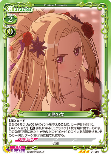 | 〔EXカード〕自分の【モウリョウ】がポイントを与えるごとに、カードを1枚引く。[メイン/自分]:《0》手札にある【モウリョウ】1枚を場に出す。その後、この効果で場に出たキャラの上に+10/+10コインを3個乗せる。そのカードは、ターン終了時に捨て札になる。 | ||