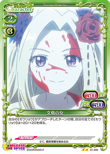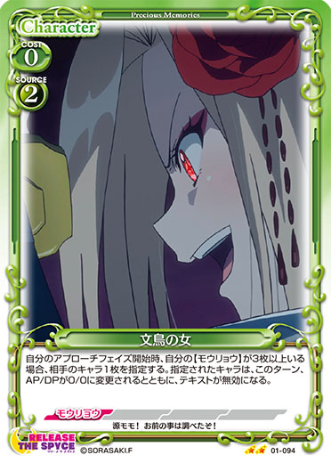 | 自分のアプローチフェイズ開始時、自分の【モウリョウ】が3枚以上いる場合、相手のキャラ1枚を指定する。指定されたキャラは、このターン、AP/DPが0/0に変更されるとともに、テキストが無効になる。 | ||