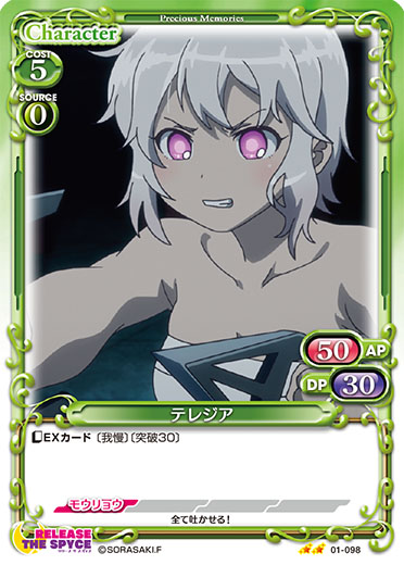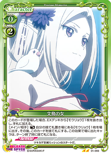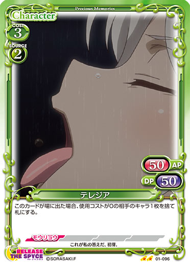 | このカードが場に出た場合、使用コストが0の相手のキャラ1枚を捨て札にする。 | ||