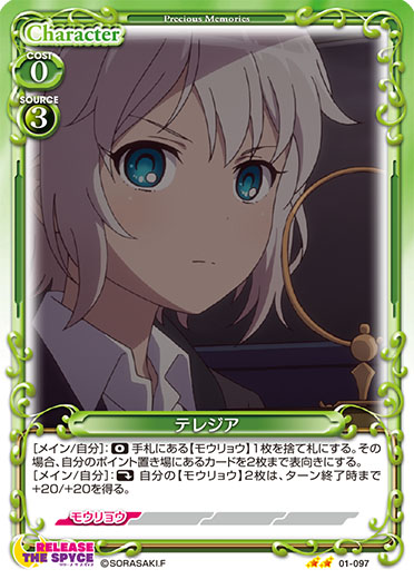 | [メイン/自分]:《0》手札にある【モウリョウ】1枚を捨て札にする。その場合、自分のポイント置き場にあるカードを2枚まで表向きにする。[メイン/自分]:《休》自分の【モウリョウ】2枚は、ターン終了時まで+20/+20を得る。 | ||