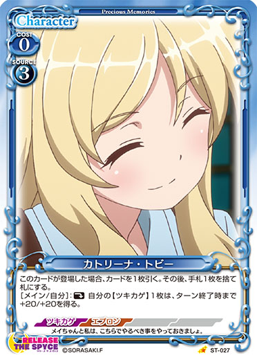 | このカードが登場した場合、カードを1枚引く。その後、手札1枚を捨て札にする。[メイン/自分]:《休》自分の【ツキカゲ】1枚は、ターン終了時まで+20/+20を得る。 | ||