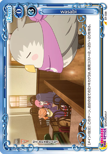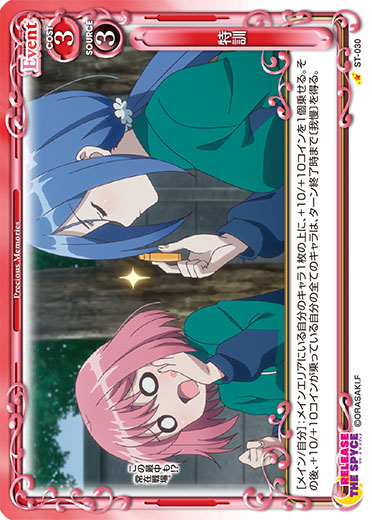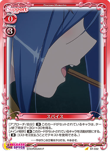 | [アプローチ/自分]:《3》このカードがセットされているキャラは、ターン終了時まで+30/+30を得る。[メイン/相手]:《3》このカードがセットされているキャラを活動状態にする。(《3》:コストを3支払うことでテキストを使用できる。) | ||