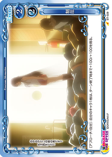 | [アプローチ/自分]:自分のキャラ1枚は、ターン終了時まで+100/+100を得る。 | ||