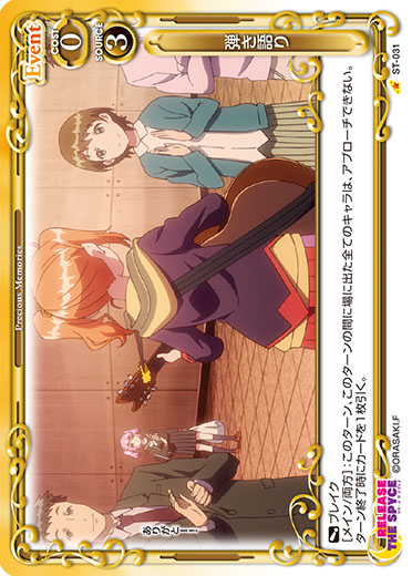 | 〔ブレイク〕[メイン/両方]:このターン、このターンの間に場に出た全てのキャラは、アプローチできない。ターン終了時にカードを1枚引く。 | ||
