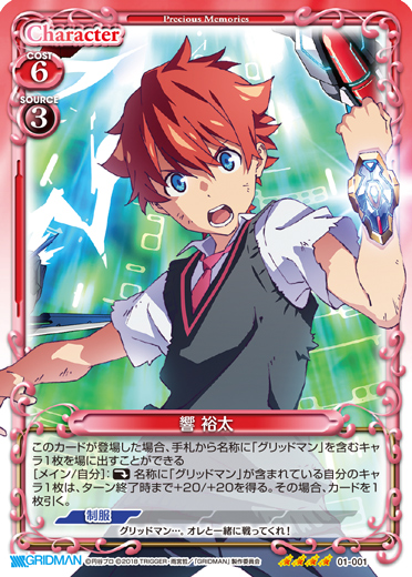 | このカードが登場した場合、手札から名称に「グリッドマン」を含むキャラ1枚を場に出すことができる。[メイン/自分]:《休》名称に「グリッドマン」が含まれている自分のキャラ1枚は、ターン終了時まで+20/+20を得る。その場合、カードを1枚引く。 | ||