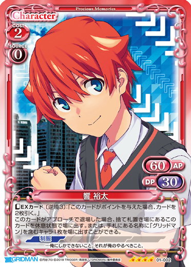 | 〔EXカード〕〔逆境3〕:「このカードがポイントを与えた場合、カードを2枚引く。」このカードがアプローチで退場した場合、捨て札置き場にあるこのカードを休息状態で場に出す。または、手札にある名称に「グリッドマン」を含むキャラ1枚を場に出すことができる。 | ||